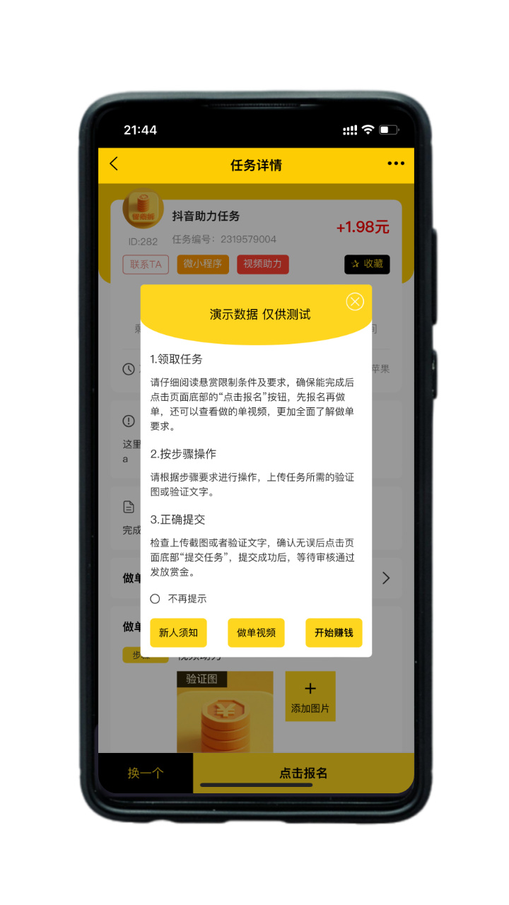 佣金金额公开标注无隐藏,完成任务后收益实时可见,支持微信 / 支付宝秒级提现,无最低门槛,1元即可提现;同时设立任务审核双机制,保障供需双方权益,让赚钱更安心。