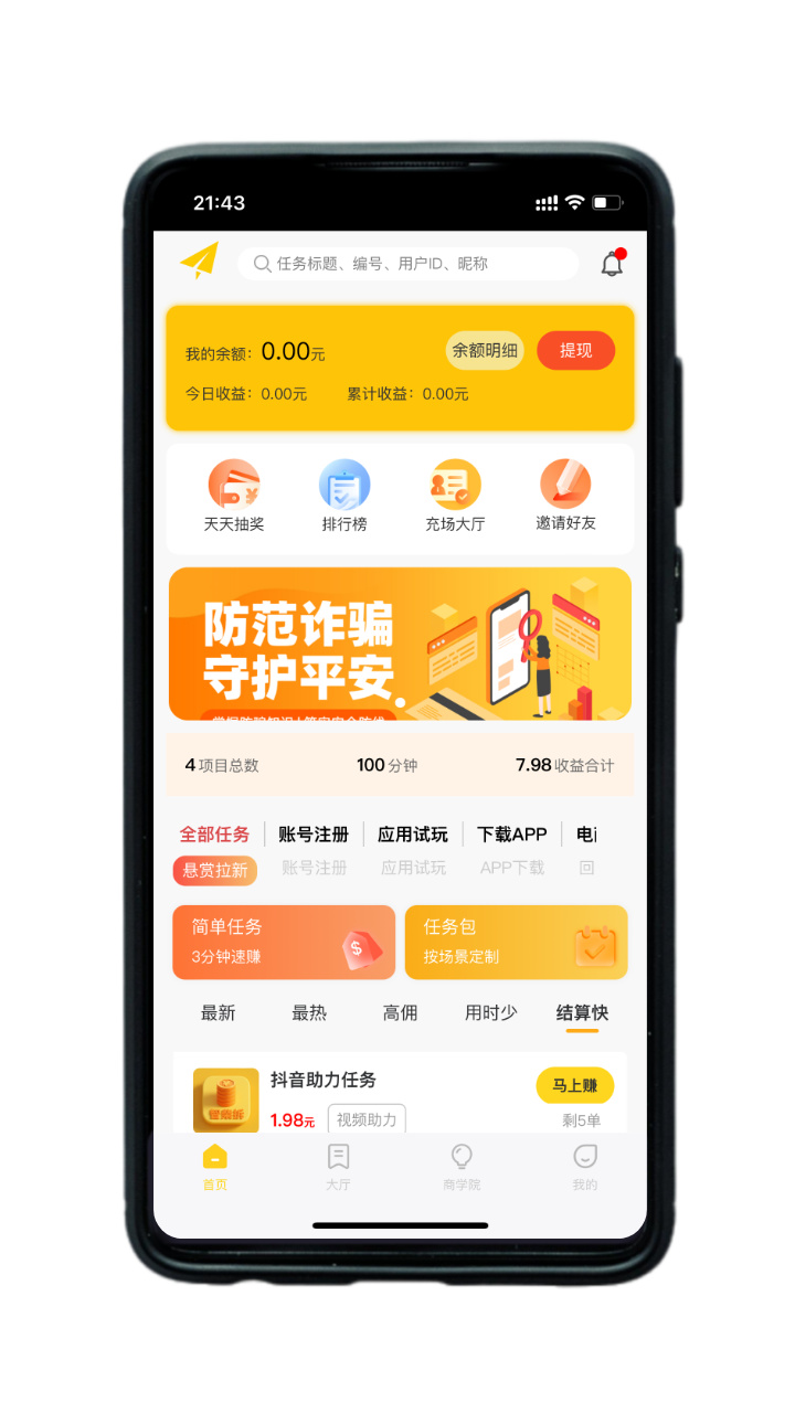 一款专为碎片时间变现设计的手机赚钱 APP,核心聚焦悬赏任务模式,合规靠谱且上手无门槛,平台整合了丰富任务资源,涵盖线上基础操作、数据整理、应用体验等多种类型,单任务金额 0.2-15 元不等,兼顾快速完成的小额任务与收益更高的进阶任务,最大亮点是提现门槛极低,1 元即可申请兑现,到账流程透明稳定,无需复杂操作,无论学生、上班族还是宝妈,只需一部手机,就能利用通勤、午休等零散时间接单赚钱,合理分配时间、筛选高性价比任务,单日收益可达 50-200+(具体收益因人而异),APP 界面简洁直观,任务分类清晰,新手无需专业技能也能快速上手,是轻松补充零花钱的实用工具。